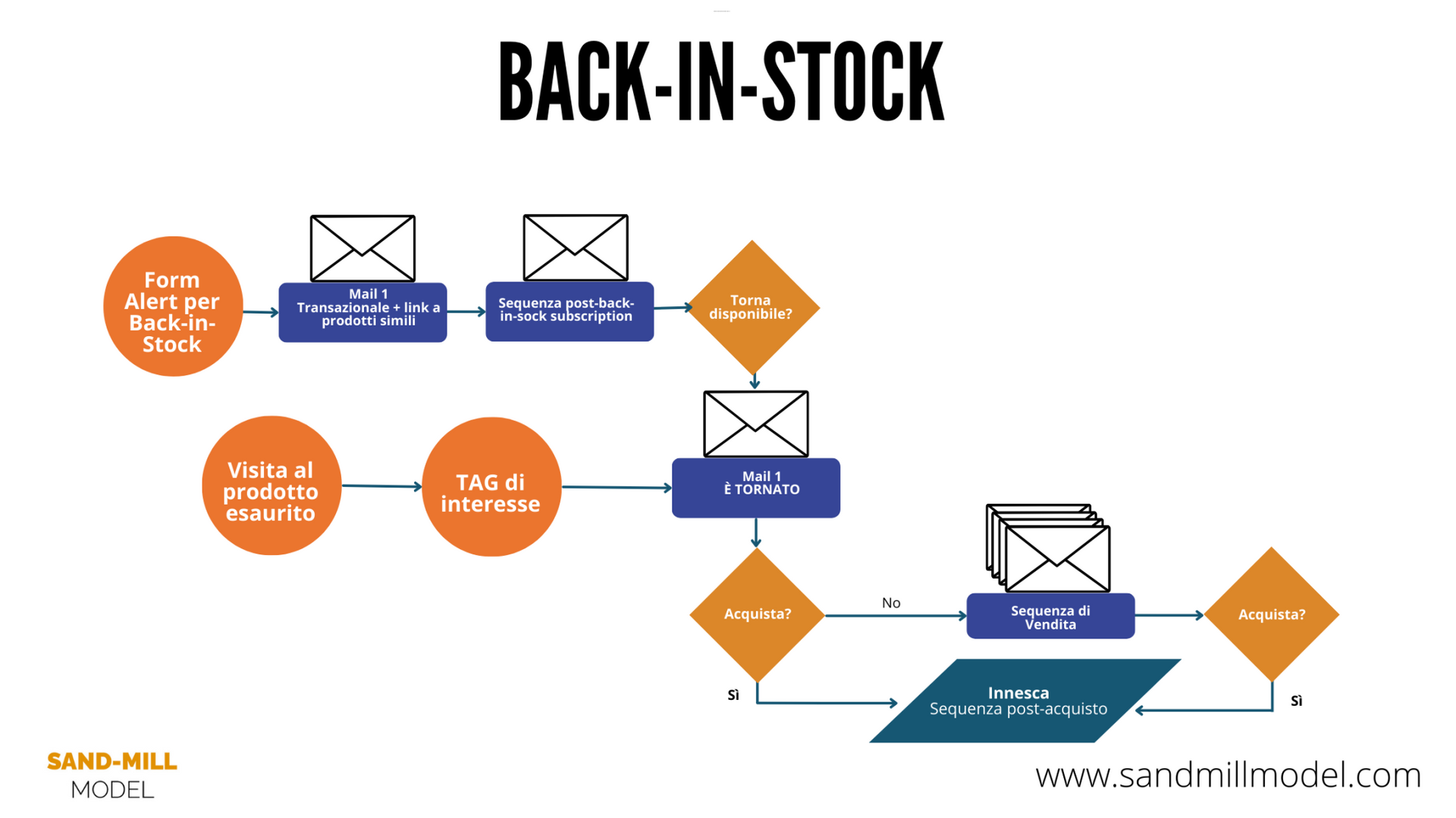 La sequenza di notifica per il back-in-stock è una serie di email automatizzate che vengono inviate ai clienti che si sono registrati al form per il back-in-stock alert non appena il prodotto è di nuovo disponibile.