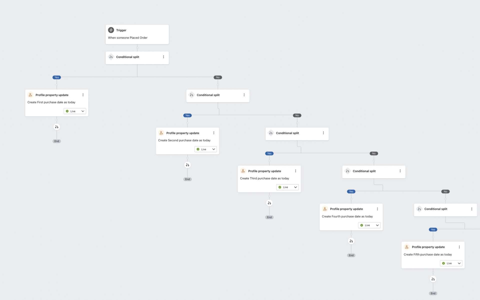 Another technique I use is to make a time stamp of each purchase by saving a custom date for First Purchase, Second Purchase, Third Purchase, and so on.