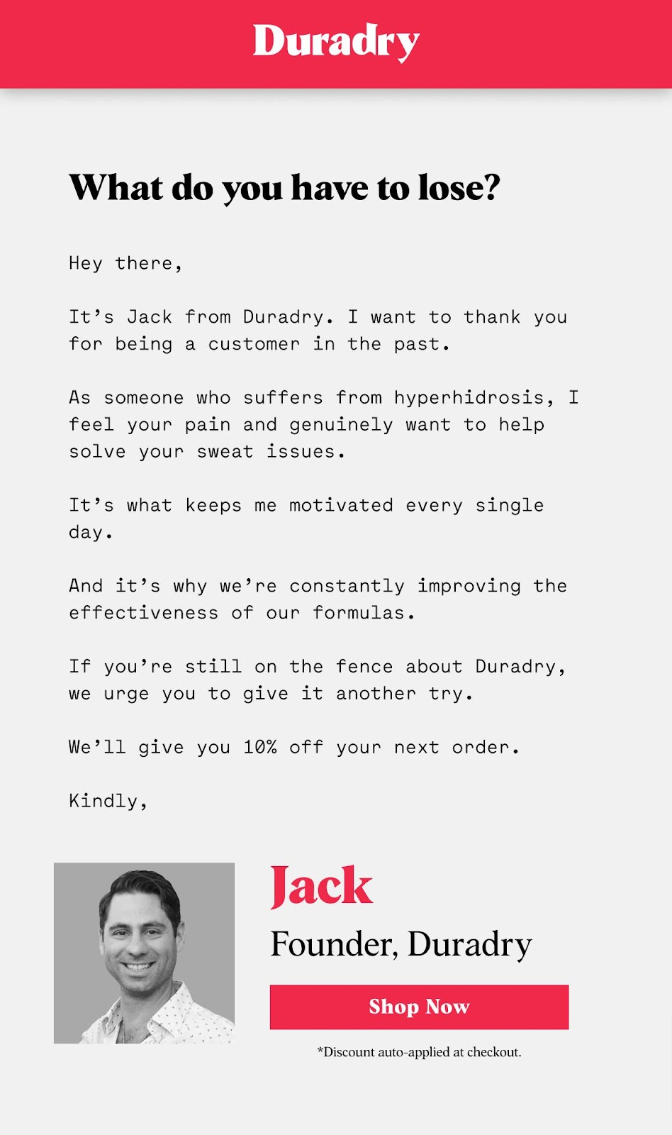 An effective idea is to have the Win Back email sent directly in the name of the company's Founder.