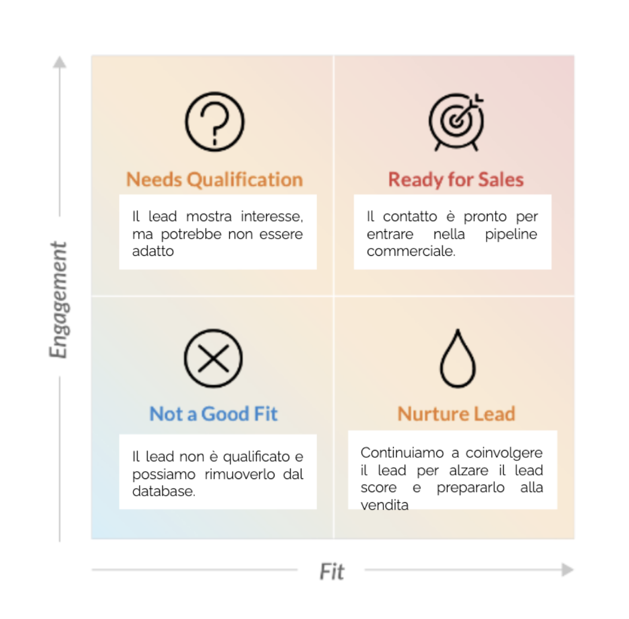 Nei quattro quadranti identifichiamo i contatti che hanno le caratteristiche per diventare clienti (fit) e il loro score (il livello di engagement).
